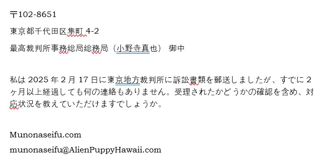 「控訴人の訴状に署名し、中国語と日本語の両方で読んだ後、訴状に記載されているウェブサイトにアクセスしました。訴状の1ページ目(下記スクリーンショット#001参照)で、控訴人は訴訟費用の支払いについて言及し、裁判所職員から訴訟費用の支払い方法について指示を受けたいと希望していました。しかし、東京地方裁判所は控訴人に対し、訴訟が受理されたかどうかも、棄却されたかどうかも明らかにせず、訴訟費用の支払い方法や支払い時期についても何も指示しませんでした。裁判所の担当官にこの件について説明を求めてください。」
